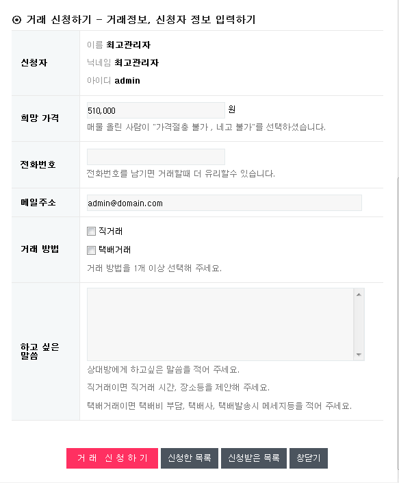 . 각 매매글에 "거래 신청하기" 기능으로 "희망가격, 연락처, 거래방법, 하고싶은 말씀"을 매매자에게 전하기