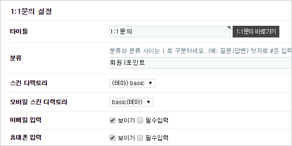 1:1 문의 게시판은 '1:1 문의 설정'에서 수정해야 합니다.