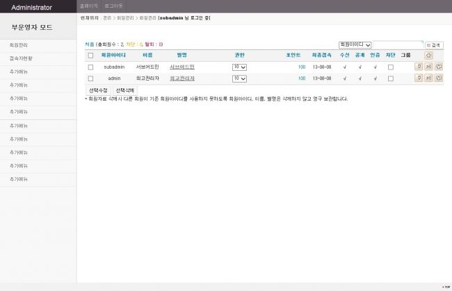 부운영자들에게 부관리자모드를 따로 마련해 줄수 있게 하였습니다.