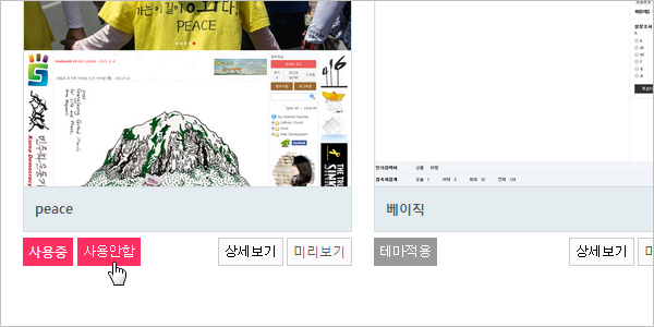 혹 자동으로 적용이 되어버렸거나, 연습 삼아 '테마 적용'을 한 경우 '사용 안함'을 눌러주면 됩니다.