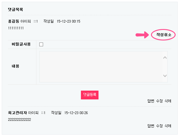 게시판 댓글의 답변을 작성할 때 작성 취소 링크 넣기 정보
