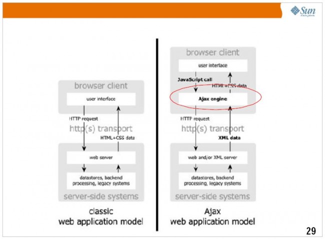 이 슬라이드(그림)는 또한 예전의 경우와(왼쪽) ajax의 경우를 보여주고 있습니다.