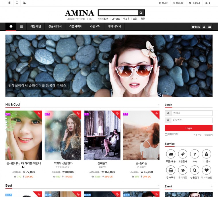 ※ 부트스트랩3 기반에 반응형/비반응형 통합 레이아웃으로 데모사이트( http://amina.co.kr/demo/shop/?pv=Basic )의 좌측상단에 있는 Switcher에서 반응형/비반응형에 따른 레이아웃 설정 및 위젯설정 등을 미리보기하실 수 있습니다.