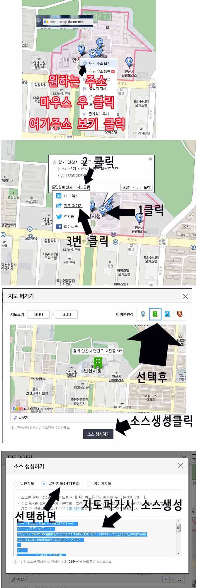 * 지도 퍼가기 서비스를 2개 이상 넣을 경우, 설치 스크립트는 하나만 삽입합니다.